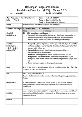 Mata pelajaran pendidikan kesenian masa 900 1000 pagi. 23 Menzahirkan idea dan konsep melalui pelbagai sumber dalam penjanaan tugasan. Rancangan Pengajaran Harian Pendidikan Kesenian PSV Tahun 2 3 Hari.