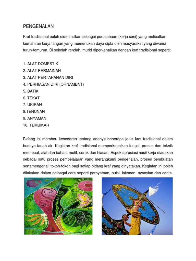 Batik ialah hasil kraf yang dihasilkan melalui proses menerap lilin dan mencelup kain b. Diharap apa yang dirungkaikan ini nanti dapat memenuhi kehendak tugasan pada kali ini. Alat domestik Alat permainan Alat pertahanan diri Perhiasan diri ornamen Batik.